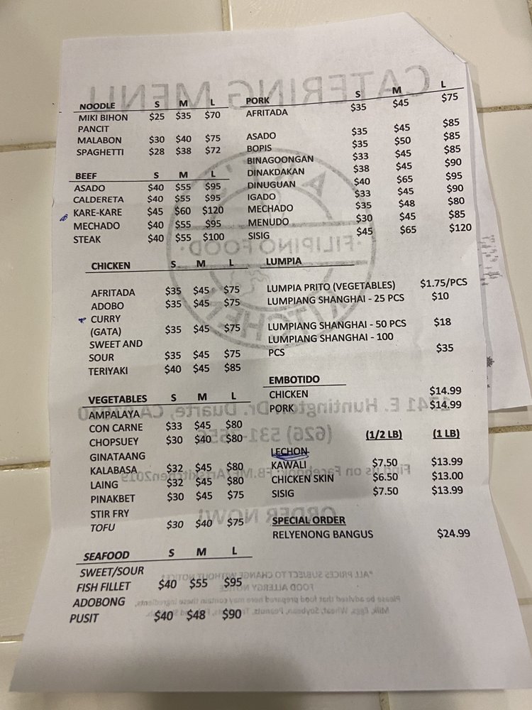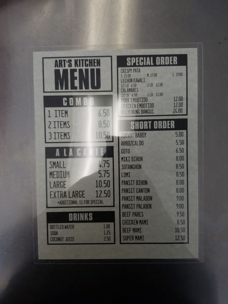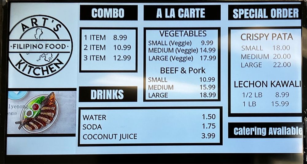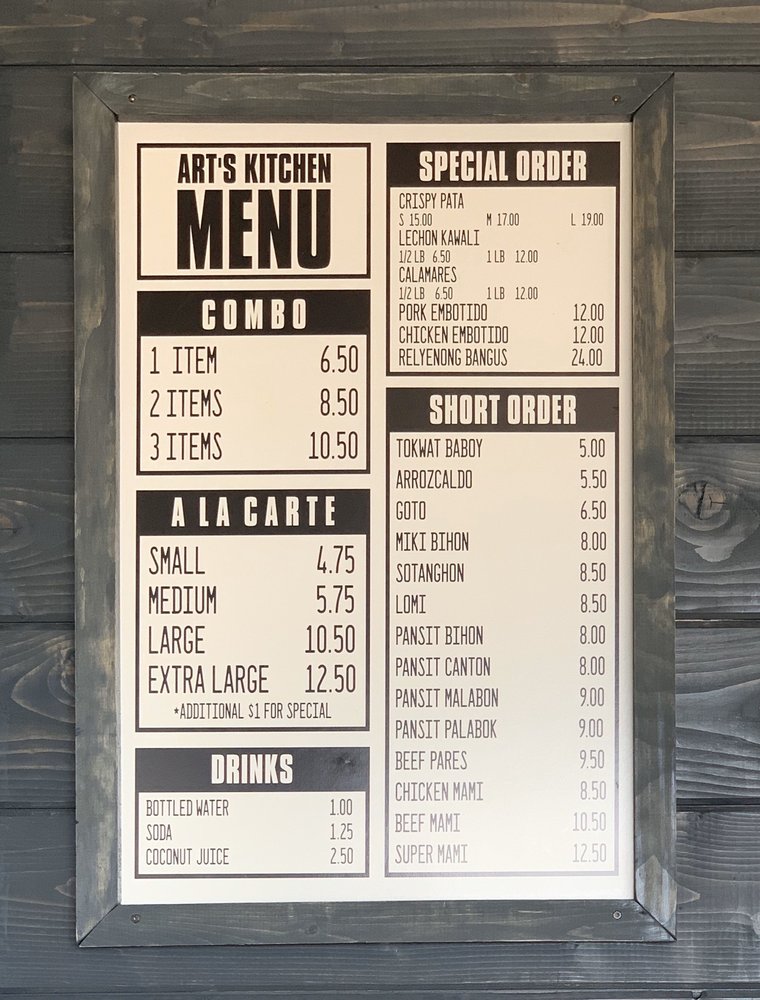 Welcome to Art’s Kitchen, a vibrant culinary gem located in Duarte, CA. With an enticing menu that showcases the rich flavors of Filipino cuisine, Art’s Kitchen is a must-try for food lovers. Each dish is expertly crafted, featuring beloved staples like Chicken Adobo, Beef Sinigang, and Bangus Steak, each priced at just $11.99. The extensive selection allows you to create your own flavorful combo, with options starting from $11.99 for one item to $15.99 for three.